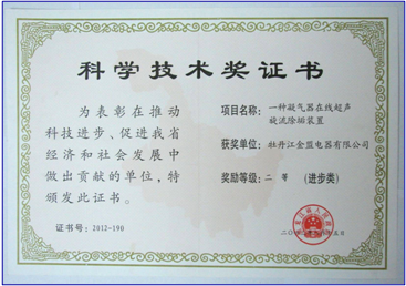 2010年,“一種凝汽器在線超聲波旋流除垢裝置”在電力系統(tǒng)200MW機(jī)組凝汽器安裝使用,填補了國內(nèi)空白,該項目于2012年獲得黑龍江省人民政府 “科學(xué)技術(shù)二等獎”,2013年,獲得國內(nèi)“首臺套獎勵”。